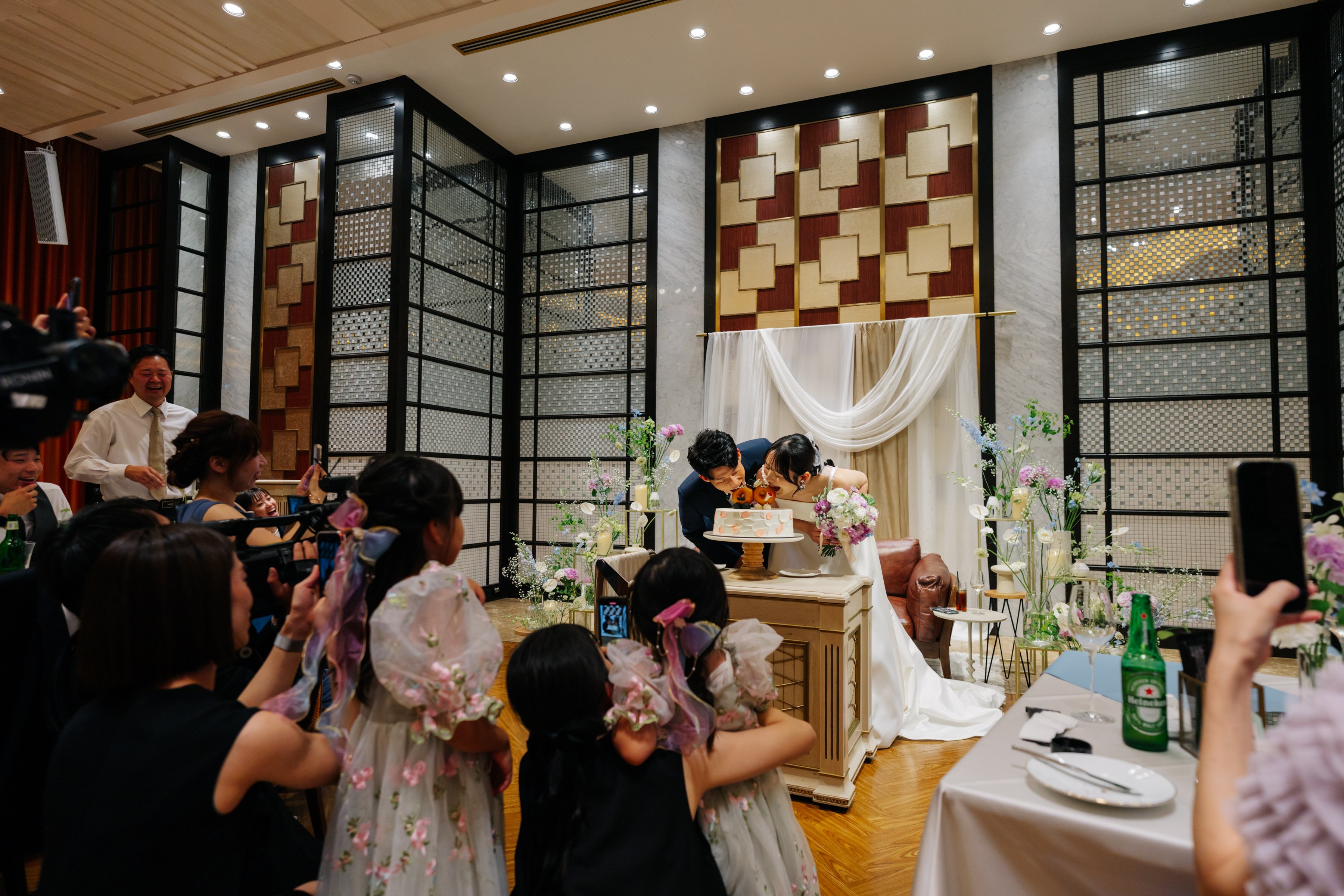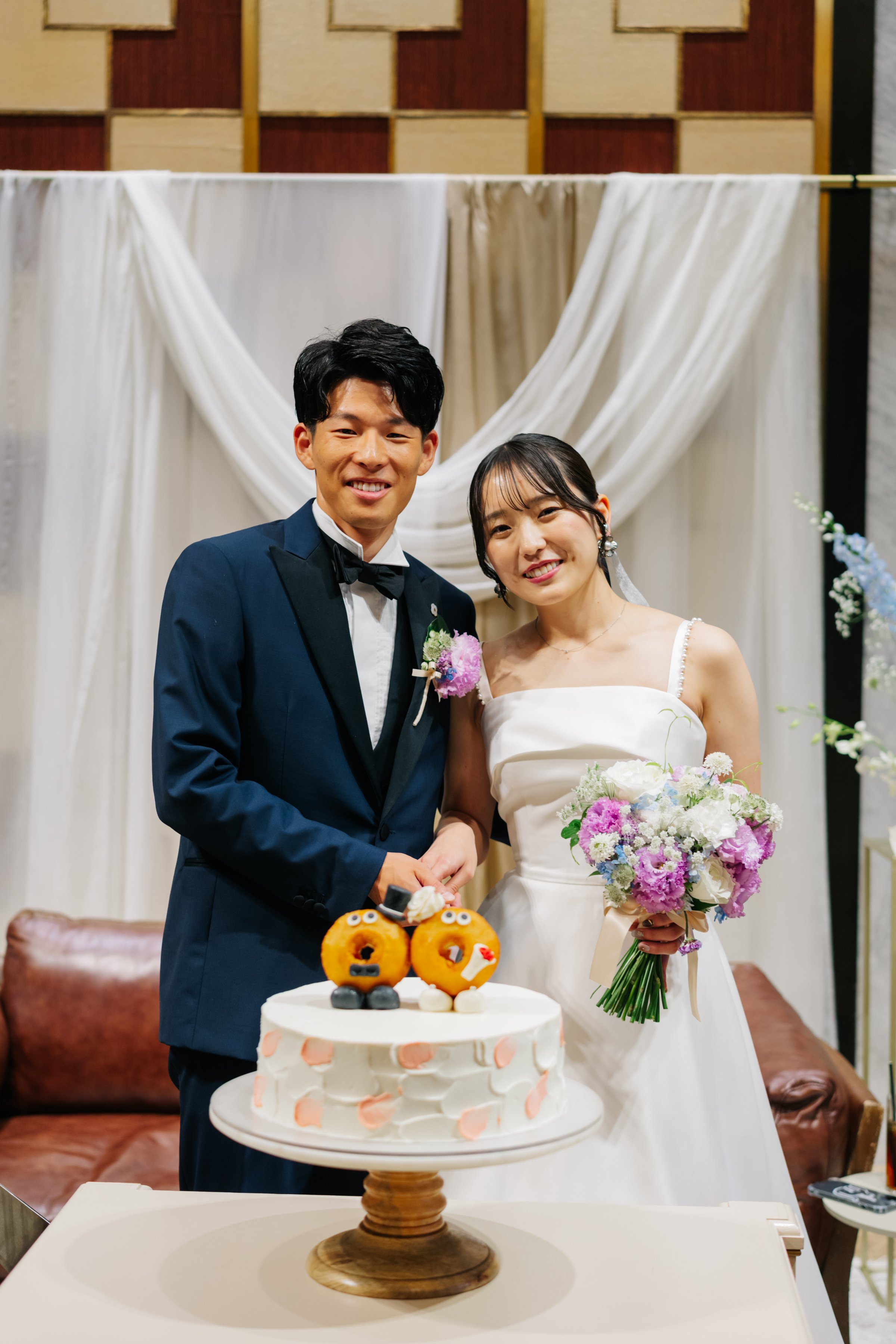 ケーキセレモニーでは、他では見たことがないようなケーキや演出にしたいという想いから、ファーストバイトをケーキではなく、新郎新婦に見立てたドーナツにかぶりつくことにしました。当日は不安や緊張も抱いていましたが、とても楽しかったです。普段はない非日常を存分に味わうことができました。もう一度結婚式当日に戻ってやりたいくらいです!