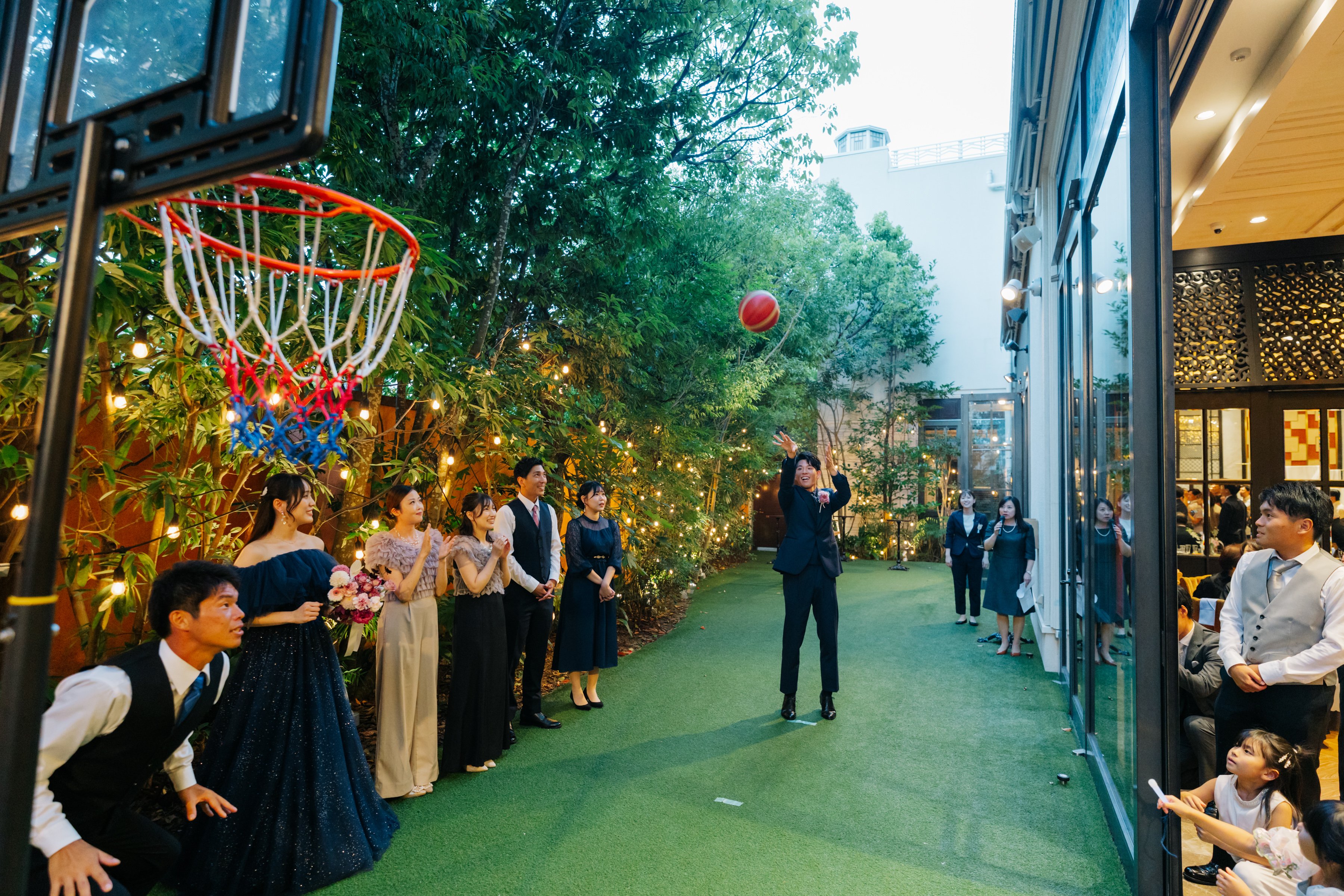 式当日のお料理は、品数や食材を自分たちの好みに調整したり、デザートビュッフェ・ウェルカムドリンクなど、ゲストの皆様に満足していただけるものを提供させていただきました。また、プランナーさんに提案していただいた各テーブルの代表者対抗「フリースロー大会」は、ゲスト全員で盛り上がることができ良かったです。